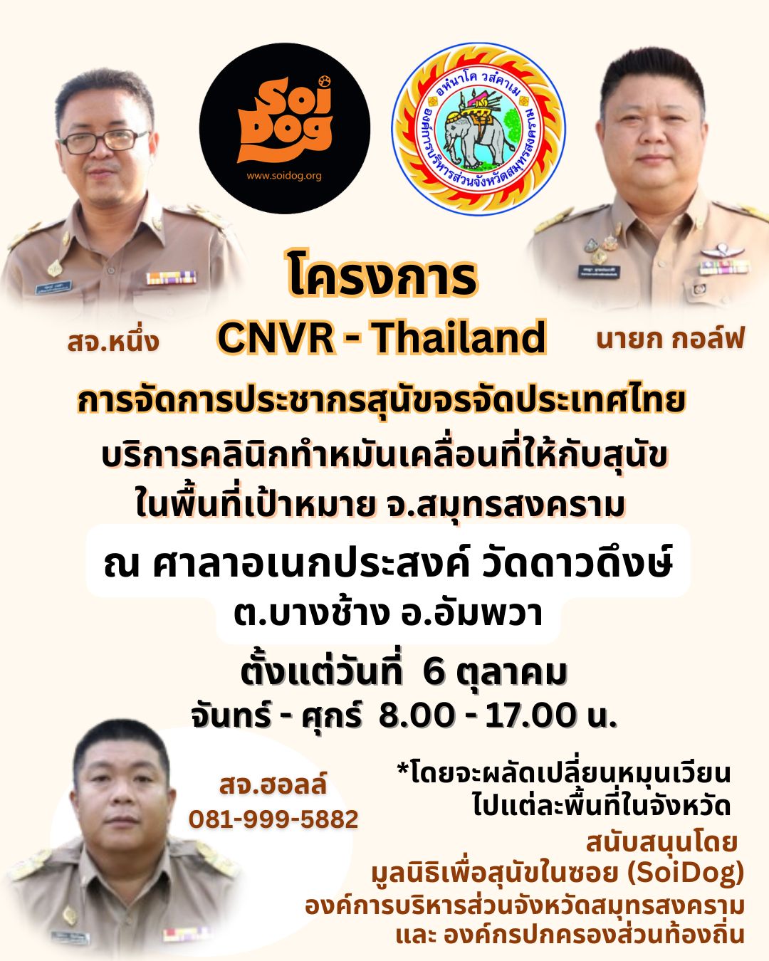 ซึ่งตอนนี้ได้ตั้งศูนย์ทำหมันสุนัขที่ โดมอเนกประสงค์ วัดดาวดึงษ์ ต.บางช้าง อ.อัมพวา