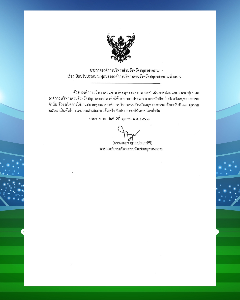 ประกาศจากองค์การบริหารส่วนจังหวัดสมุทรสงคราม สนามฟุตบอล อบจ.สมุทรสงคราม จะปิดปรับปรุงเฉพาะบริเวณสนามหญ้า ตั้งแต่วันที่ 13 ตุลาคม 2568 เป็นต้นไป ทั้งนี้ ลู่วิ่งรอบสนามยังเปิดให้ประชาชนเข้าใช้บริการได้ตามปกติ หากมีความจำเป็นต้องปิดลู่วิ่งเพื่อความปลอดภัยของผู้ใช้บริการ องค์การบริหารส่วนจังหวัดสมุทรสงคราม จะแจ้งให้ทราบภายหลัง ขออภัยในความไม่สะดวก และขอขอบคุณทุกท่านที่ให้ความร่วมมือ
