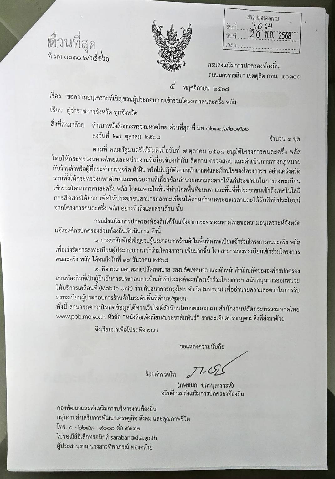 ประชาสัมพันธ์เชิญชวนผู้ประกอบการเข้าร่วมโครงการคนละครึ่ง พลัส