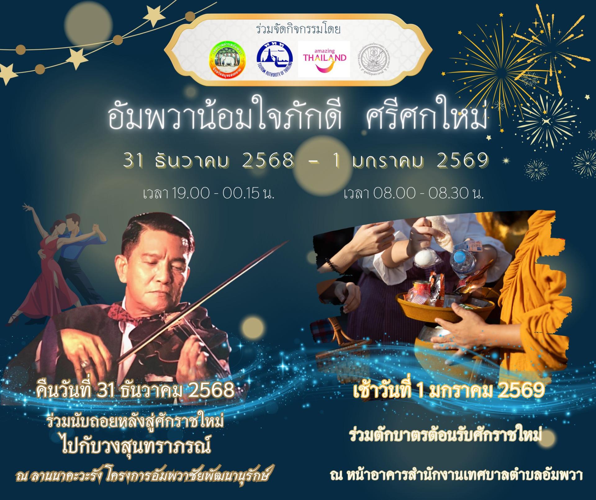 เทศบาลตำบลอัมพวา ร่วมกับ การท่องเที่ยวแห่งประเทศไทย สำนักงานสมุทรสงคราม ขอเชิญชวนทุกท่าน ร่วมนับถอยหลังเข้าสู่ศักราชใหม่ 2569 กับกิจกรรมส่งเสริมการท่องเที่ยวเพื่อกระตุ้นเศรษฐกิจ "อัมพวาน้อมใจภักดี ศรีศกใหม่" ติดตามรายละเอียดเพิ่มเติมที่ เฟซบุ๊ค : งานประชาสัมพันธ์ ทต.อัมพวา และเพจ เทศบาลตำบลอัมพวา