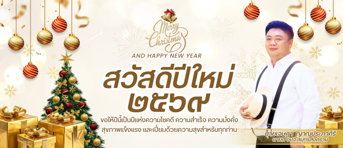 Merry Christmas and Happy New Year" อบจ.สมุทรสงครามขอส่งความปรารถนาดีไปยังพี่น้องประชาชนทุกท่าน ขอให้ปีใหม่นี้เป็นปีแห่งความโชคดี ความสำเร็จ ความมั่งคั่ง สุขภาพแข็งแรงและเปี่ยมด้วยความสุขสำหรับทุกท่าน เราพร้อมมุ่งมั่นปฏิบัติหน้าที่เพื่อบำบัดทุกข์ บำรุงสุข และรับใช้ประชาชนชาวสมุทรสงครามอย่างเต็มกำลัง