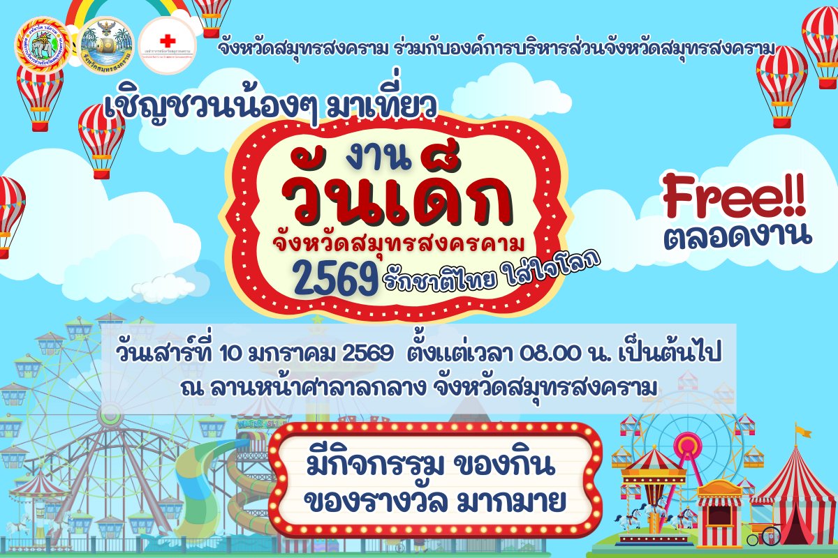 ขอเชิญชวนน้อง ๆ หนู ๆ และครอบครัว ร่วมสนุกใน *งานวันเด็กจังหวัดสมุทรสงคราม ประจำปี 2569 *วันเสาร์ที่ 10 มกราคม 2569 *ตั้งแต่เวลา 08.00 น. เป็นต้นไป *ณ ลานหน้าศาลากลางจังหวัดสมุทรสงคราม *สนุกสุดมันกับกิจกรรมสร้างสรรค์มากมาย *ของกินอร่อย ๆ *ของรางวัลแจกฟรีตลอดงาน (Free ทั้งงาน) *องค์การบริหารส่วนจังหวัดสมุทรสงคราม ขอเชิญเด็ก ๆ ทุกคนมาร่วมสร้างรอยยิ้ม ความสุข และความทรงจำดี ๆ ไปด้วยกัน