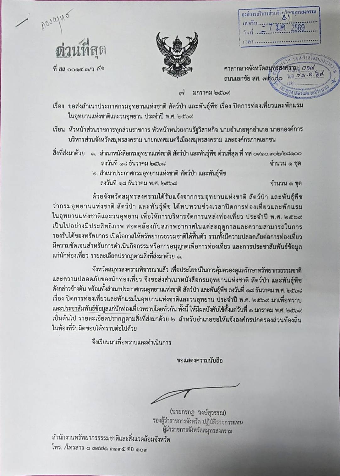 ประกาศกรมอุทยานแห่งชาติ สัตว์ป่า และพันธุ์พืช เรื่อง ปิดการท่องเที่ยวและพักแรมในอุทยานแห่งชาติและวนอุทยาน ประจำปี ๒๕๖๙