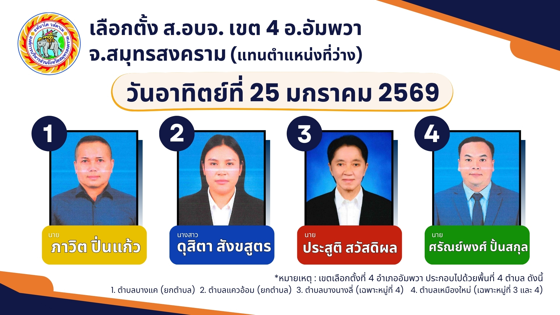 *หมายเหตุ : เขตเลือกตั้งที่ 4 อำเภออัมพวา ประกอบไปด้วยพื้นที่ 4 ตำบล ดังนี้