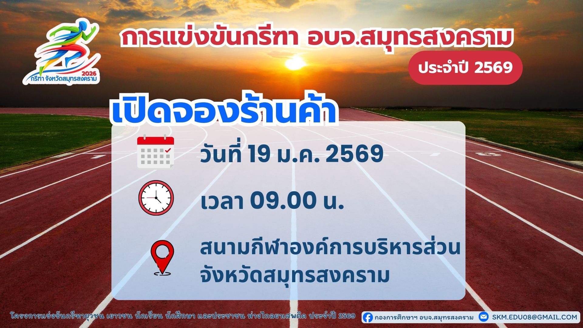 ประกาศเปิดจองร้านค้าแล้ว! ในการแข่งขันกรีฑา อบจ.สมุทรสงคราม ประจำปี 2569 วันที่ 19 มกราคม 2569 เวลา 09.00 น. สนามกีฬาองค์การบริหารส่วนจังหวัดสมุทรสงคราม เปิดจองก่อน มีสิทธิ์ก่อน สนใจสอบถามรายละเอียดเพิ่มเติมได้ที่ เพจ กองการศึกษา อบจ.สมุทรสงคราม