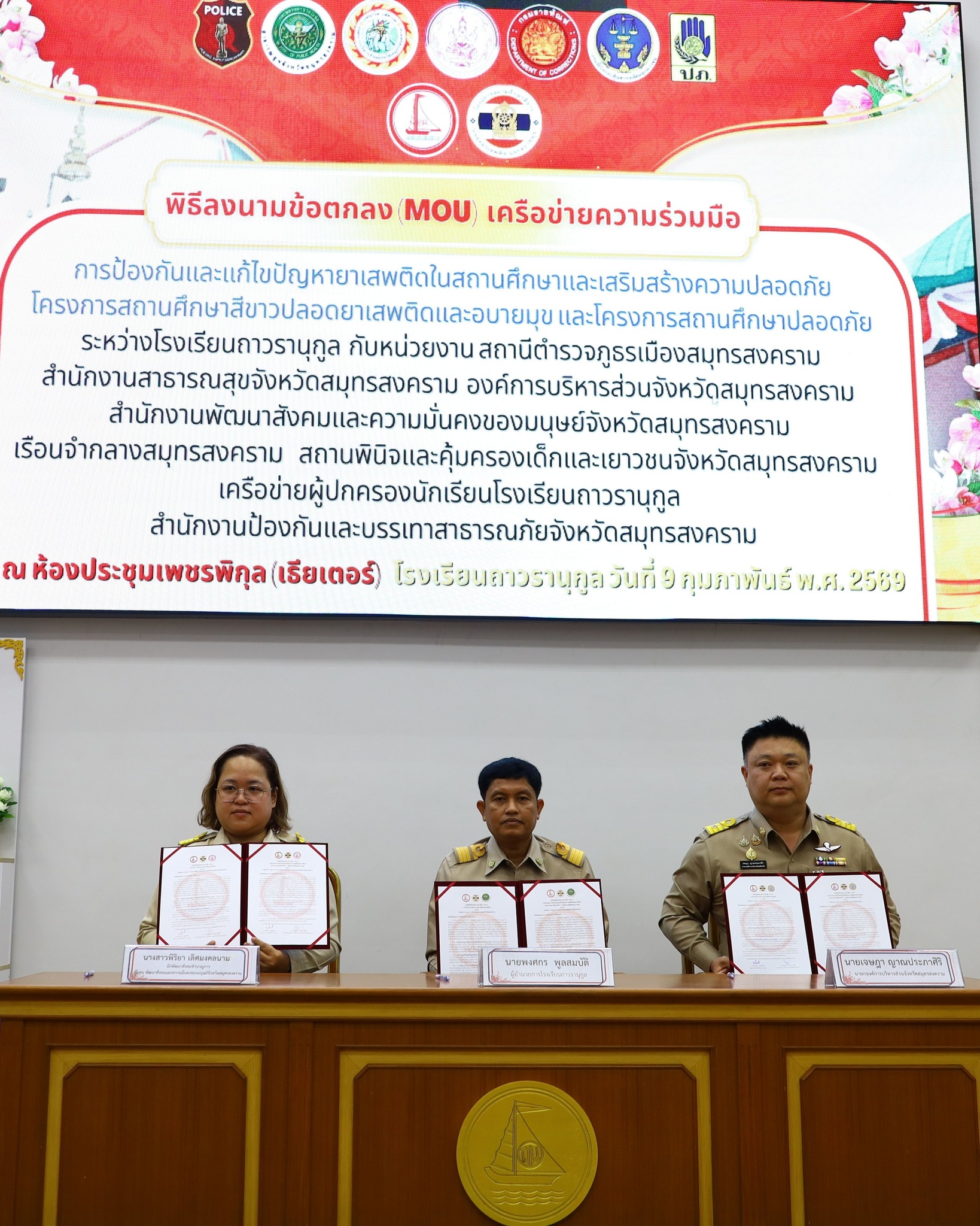 ร่วมพิธีลงนามข้อตกลง (MOU) เครือข่ายความร่วมมือ การป้องกันและแก้ไขปัญหายาเสพติดในสถานศึกษาและเสริมสร้างความปลอดภัย โครงการสถานศึกษาสีขาวปลอดยาเสพติดและอบายมุข และโครงการสถานศึกษาปลอดภัย ณ ห้องเธียร์เตอร์ โรงเรียนถาวรานุกูล