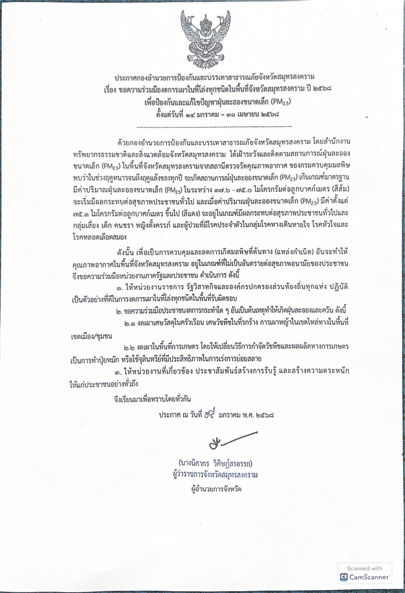 ประกาศ : ขอความร่วมมือ "งดการเผาในที่โล่งทุกชนิด" ในพื้นที่จังหวัดสมุทรสงคราม ปี 2568 เพื่อป้องกันและแก้ไขปัญหาฝุ่นละอองขนาดเล็ก (PM2.5)