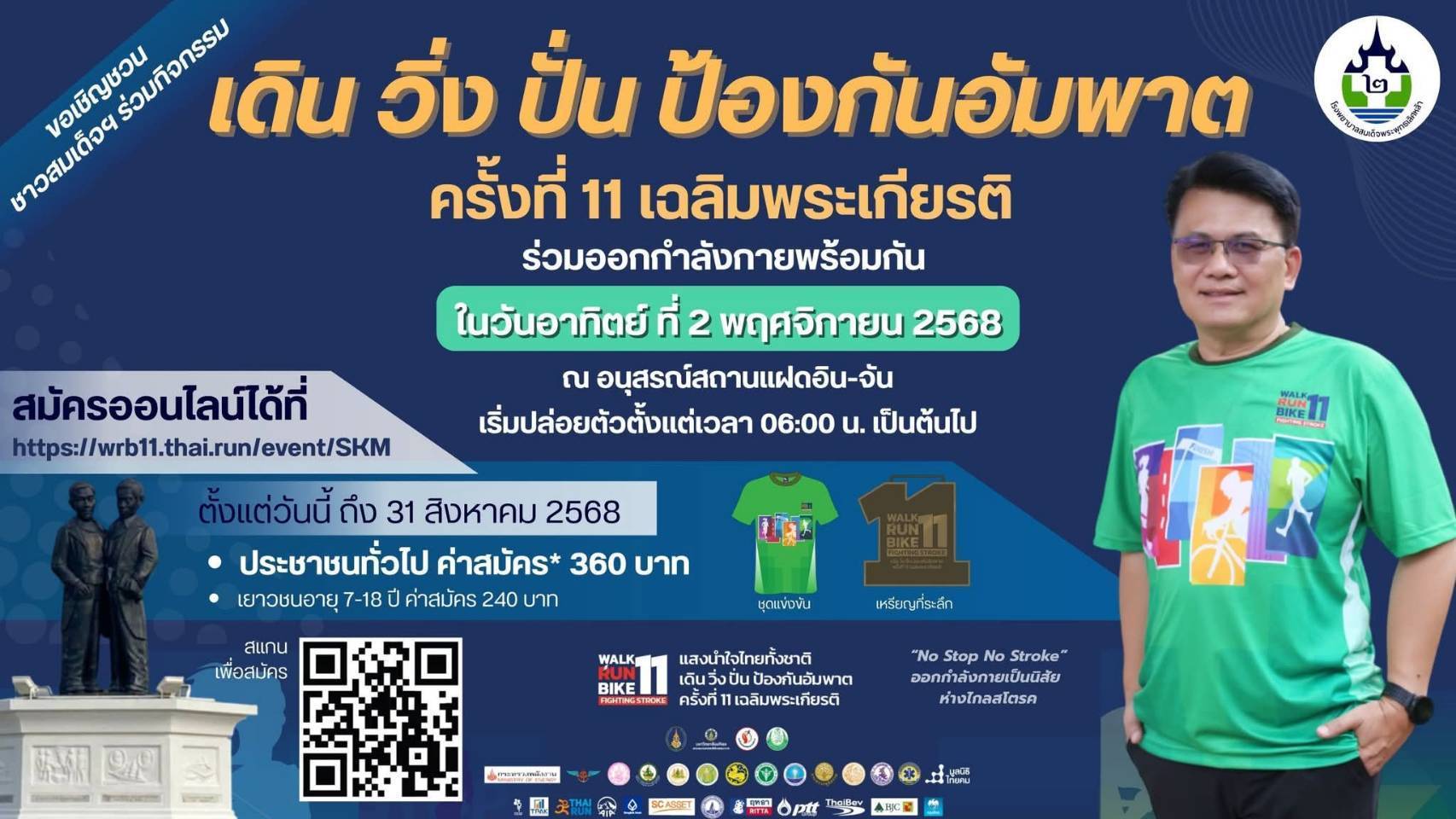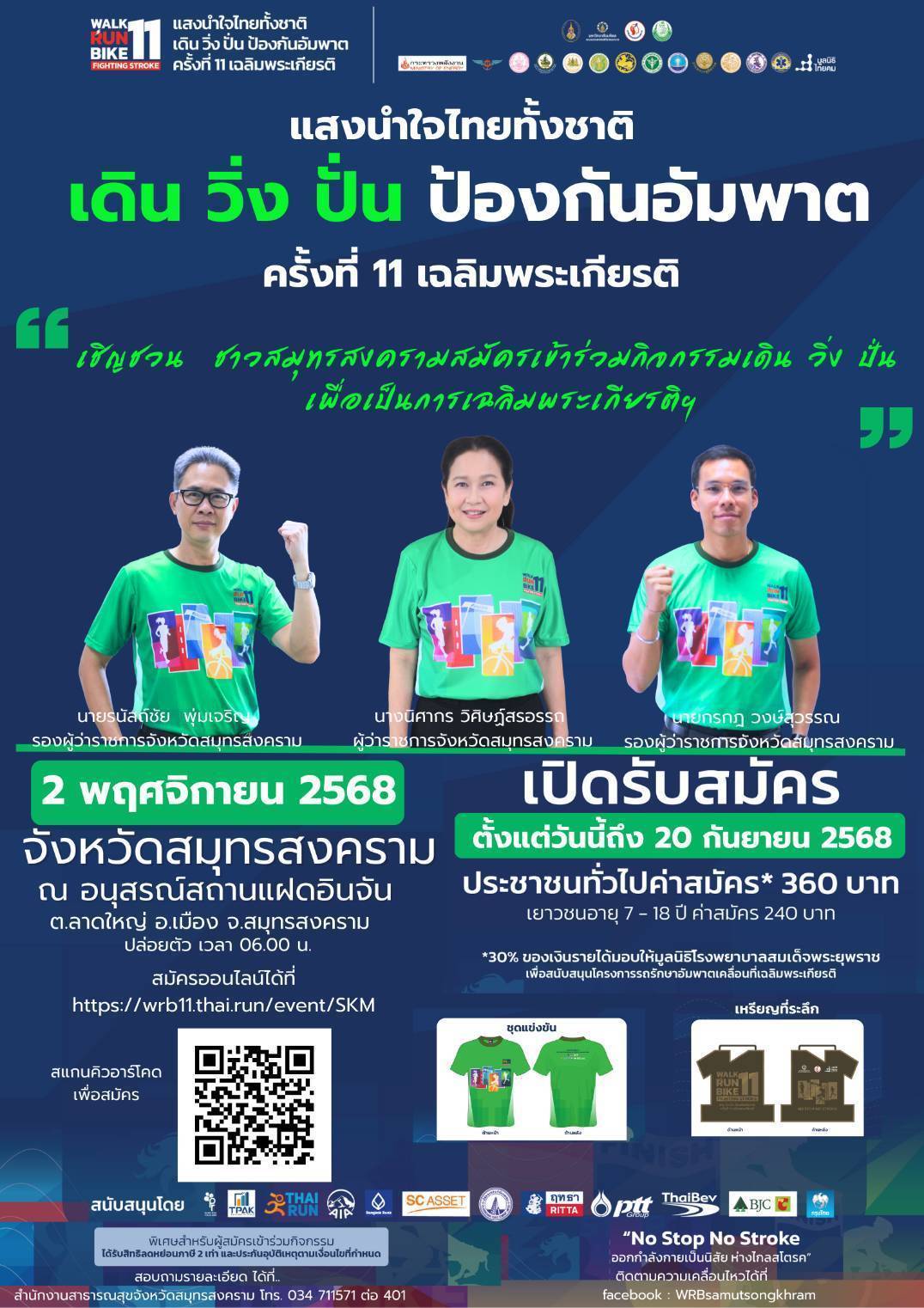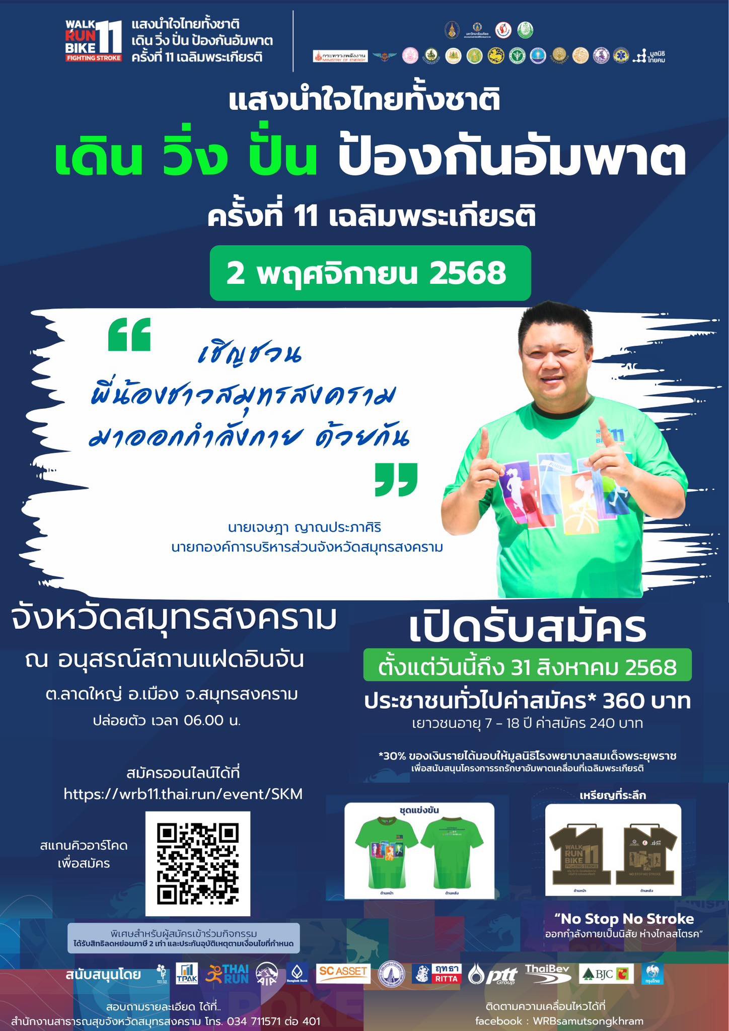 เชิญชวนสมัครเข้าร่วมกิจกรรม เดิน วิ่ง ปั่น ป้องกันอัมพาต ครั้งที่ 11 เฉลิมพระเกียรติฯ จัดพร้อมกันทั่วประเทศ 2 พฤศจิกายน 2568 สนามจังหวัดสมุทรสงคราม จัดกิจกรรมเดิน วิ่ง ปั่น ณ อนุสรณ์สถานแฝดอินจัน ตำบลลาดใหญ่ อ.เมือง จ.สมุทรสงคราม *ขยายเวลาเปิดรับสมัคร ตั้งแต่บัดนี้ - 20 กันยายน 2568