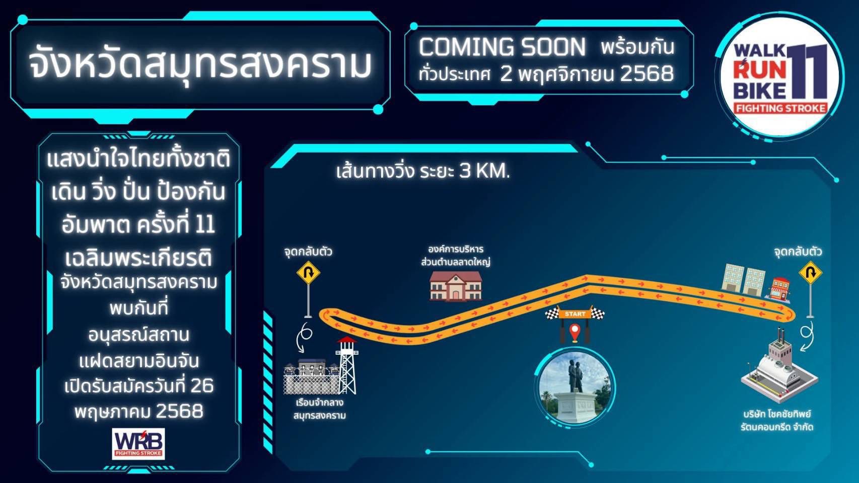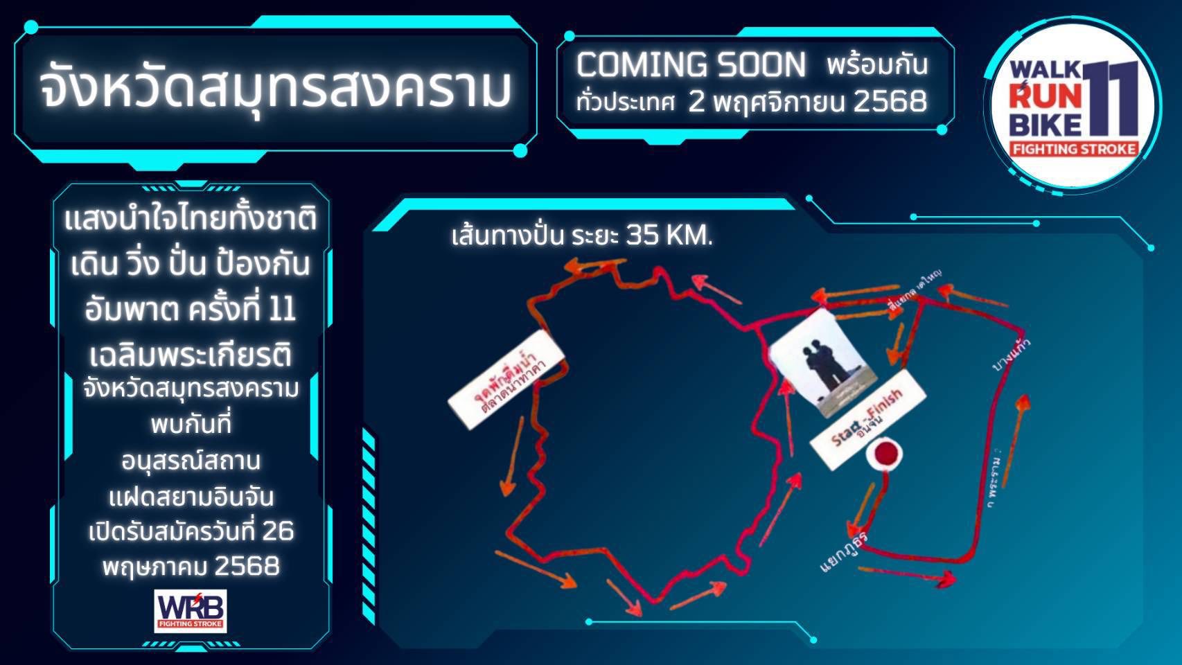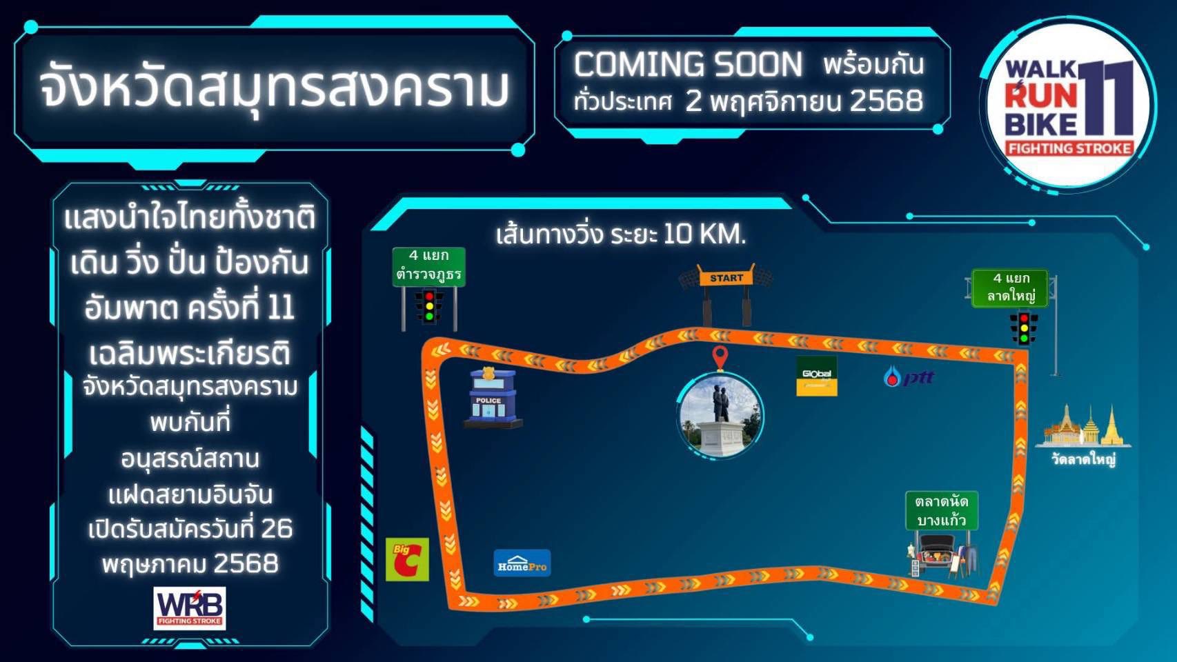 เชิญชวนสมัครเข้าร่วมกิจกรรม เดิน วิ่ง ปั่น ป้องกันอัมพาต ครั้งที่ 11 เฉลิมพระเกียรติฯ จัดพร้อมกันทั่วประเทศ 2 พฤศจิกายน 2568 สนามจังหวัดสมุทรสงคราม จัดกิจกรรมเดิน วิ่ง ปั่น ณ อนุสรณ์สถานแฝดอินจัน ตำบลลาดใหญ่ อ.เมือง จ.สมุทรสงคราม *ขยายเวลาเปิดรับสมัคร ตั้งแต่บัดนี้ - 20 กันยายน 2568
