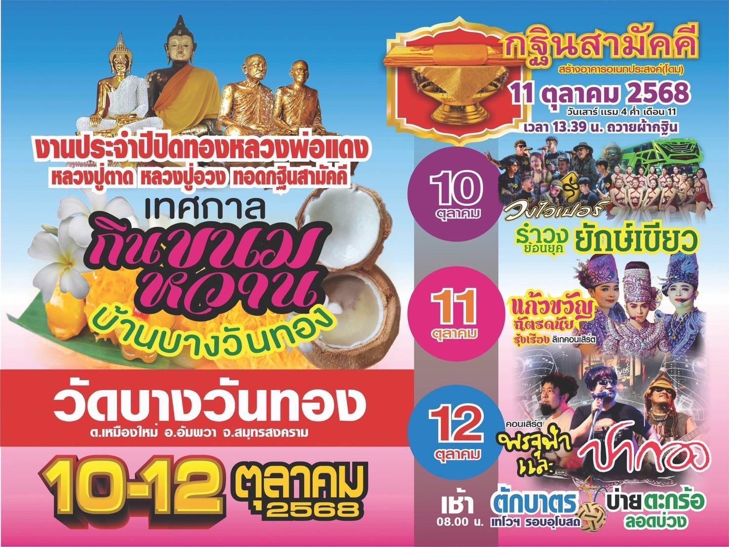 ขอเชิญเที่ยวงานประจำปีปิดทองหลวงพ่อแดง หลวงปู่ตาด หลวงปู่อวง ทอดกฐินสามัคคี วัดบางวันทอง ต.เหมืองใหม่ อ.อัมพวา จ.สมุทรสงคราม วันที่ 10–12 ตุลาคม 2568