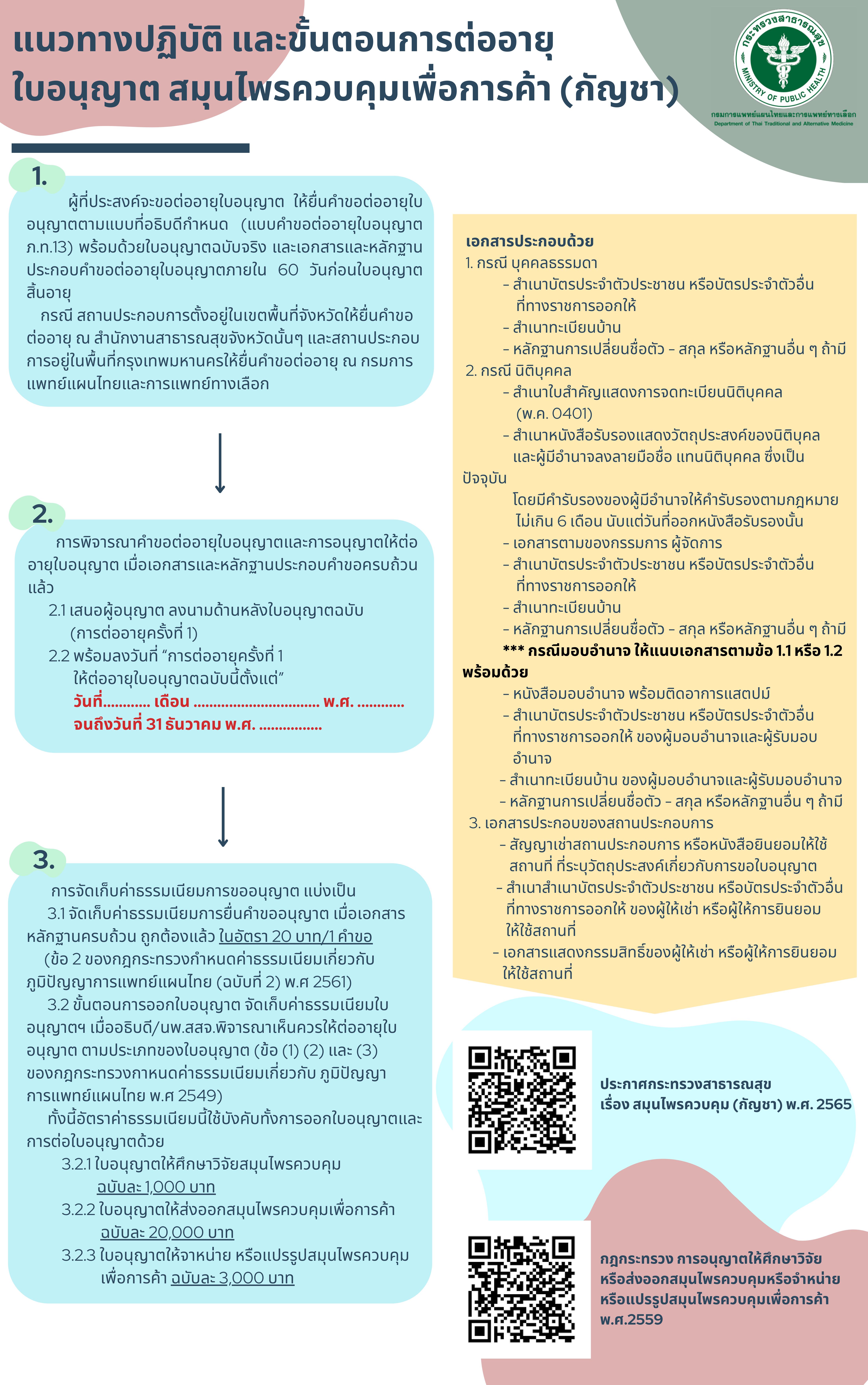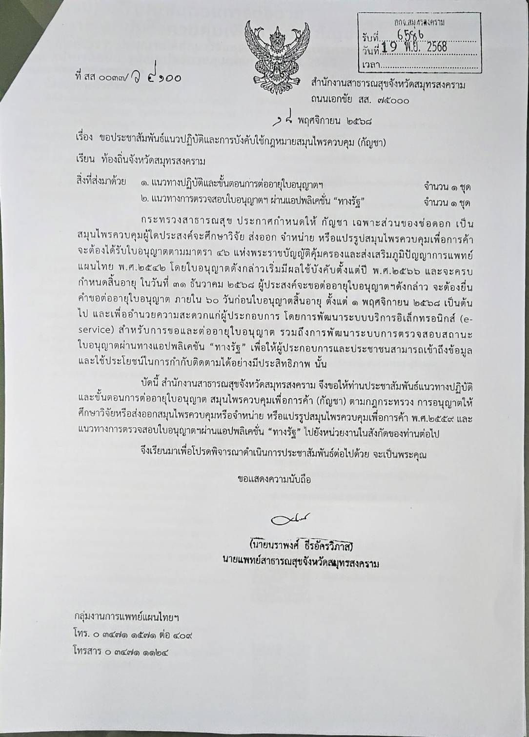 กระทรวงสาธารณสุข ประกาศกำหนดให้ กัญชา เฉพาะส่วนของช่อดอก เป็นสมุนไพรควบคุมผู้ใดประสงค์จะศึกษาวิจัย ส่งออก จำหน่าย หรือแปรรูปสมุนไพรควบคุมเพื่อการค้า จะต้องได้รับใบอนุญาตตามมาตรา 46 แห่งพระราชบัญญัติคุ้มครองและส่งเสริมภูมิปัญญาการแพทย์แผนไทย พ.ศ.2542 โดยใบอนุญาตดังกล่าวเริ่มมีผลใช้บังคับตั้งแต่ปี พ.ศ.2566 และจะครบกำหนดสิ้นอายุ ในวันที่ 31 ธันวาคม 2568 ผู้ประสงค์จะขอต่ออายุใบอนุญาตฯดังกล่าว จะต้องยื่นคำขอต่ออายุใบอนุญาต ภายใน 60 วันก่อนใบอนุญาตสิ้นอายุ ตั้งแต่ 1 พฤศจิกายน 2568 เป็นต้นไป และเพื่ออำนวยความสะดวกแก่ผู้ประกอบการ โดยการพัฒนาระบบบริการอิเล็กทรอนิกส์ (e-service) สำหรับการขอและต่ออายุใบอนุญาต รวมถึงการพัฒนาระบบการตรวจสอบสถานะใบอนุญาตผ่านทางแอปพลิเคชัน "ทางรัฐ" เพื่อให้ผู้ประกอบการและประชาชนสามารถเข้าถึงข้อมูลและใช้ประโยชน์ในการกำกับติดตามได้อย่างมีประสิทธิภาพ
