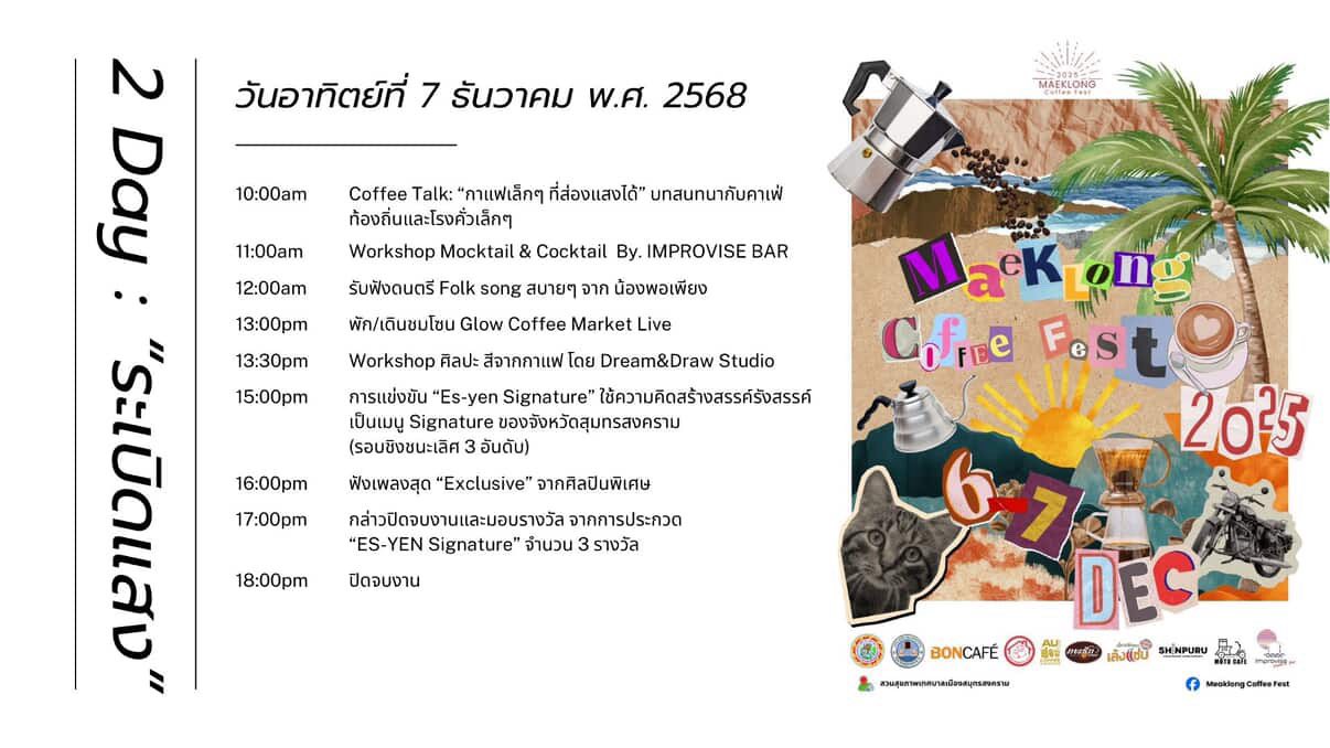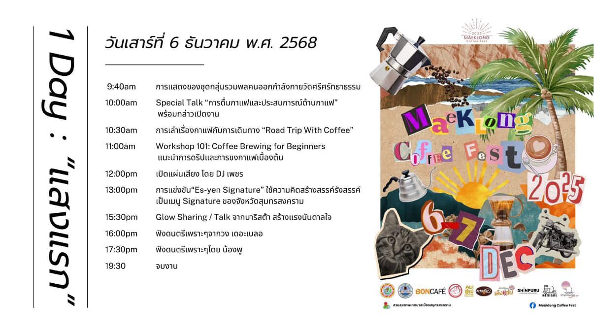 เทศกาลกาแฟของชาวสมุทรสงคราม ใกล้เริ่มแล้ว!! อบจ.สมุทรสงคราม ขอเชิญเที่ยวงาน Maeklong Coffee Fest 2025 "แม่กลองเทศกาลกาแฟฉายแสง" 6-7 ธันวาคม 2568 ณ สวนสุขภาพเทศบาลเมืองสมุทรสงคราม - การออกร้านของคาเฟ่ชื่อดังทั่วทั้งจังหวัด - การแข่งขัน Es-yen Signature - ฟังดนตรี ชมการแสดงต่างๆ - Workshop & Coffee Talk - คาราวานมอเตอร์ไซค์คลาสสิค - บูธอื่นๆอีกมากมาย