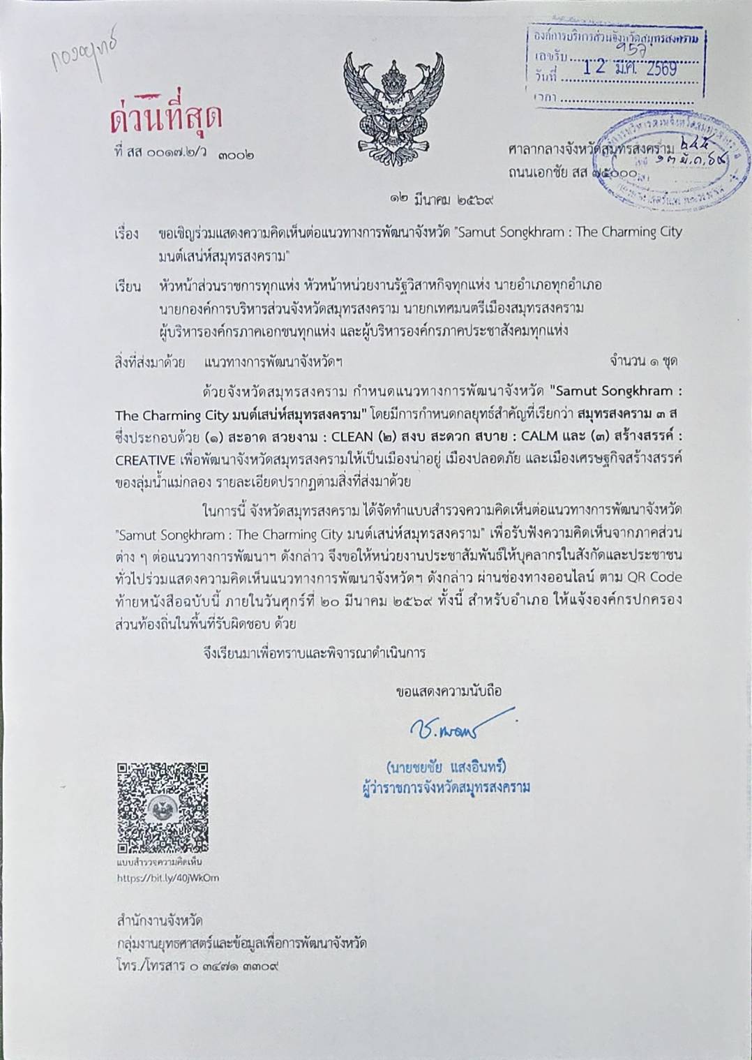 แบบสำรวจความคิดเห็นต่อแนวทางการพัฒนาจังหวัด "Samut Songkhram : The Charming City มนต์เสน่ห์สมุทรสงคราม"