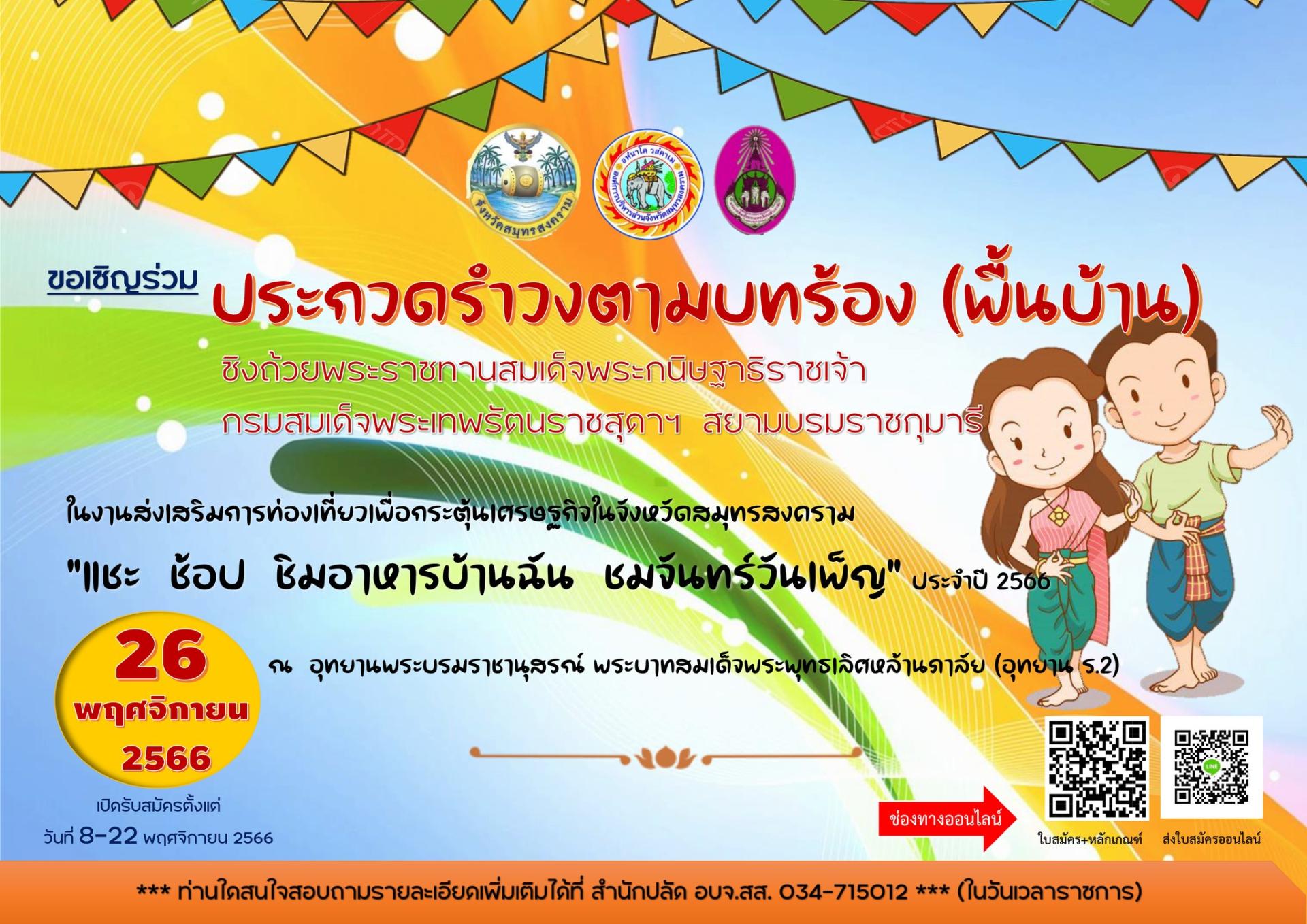 ขอเชิญร่วม ประกวดรำวงตามบทร้อง(พื้นบ้าน) ชิงถ้วยพระราชทานสมเด็จพระกนิษฐาธิราชเจ้า กรมสมเด็จพระเทพรัตนราชสุดาฯ สยามบรมราชกุมารี ในงานส่งเสริมการท่องเที่ยวและกระตุ้นเศรษฐกิจในจังหวัดสมุทรสงคราม วันที่ 26 พ.ย. นี้ ณ อุทยาน ร.๒ รับสมัครตั้งแต่บัดนี้ ถึงวันที่ 22 พ.ย. นี้ ทางช่องทางออนไลน์ สแกน QR code หรือดาวน์โหลดเอกสารเพิ่มเติม ด้านล่าง สนใจสอบถามข้อมูลเพิ่มเติมได้ที่ สำนักปลัด อบจ.สส. 034-715012 ในวัน-เวลา ราชการ